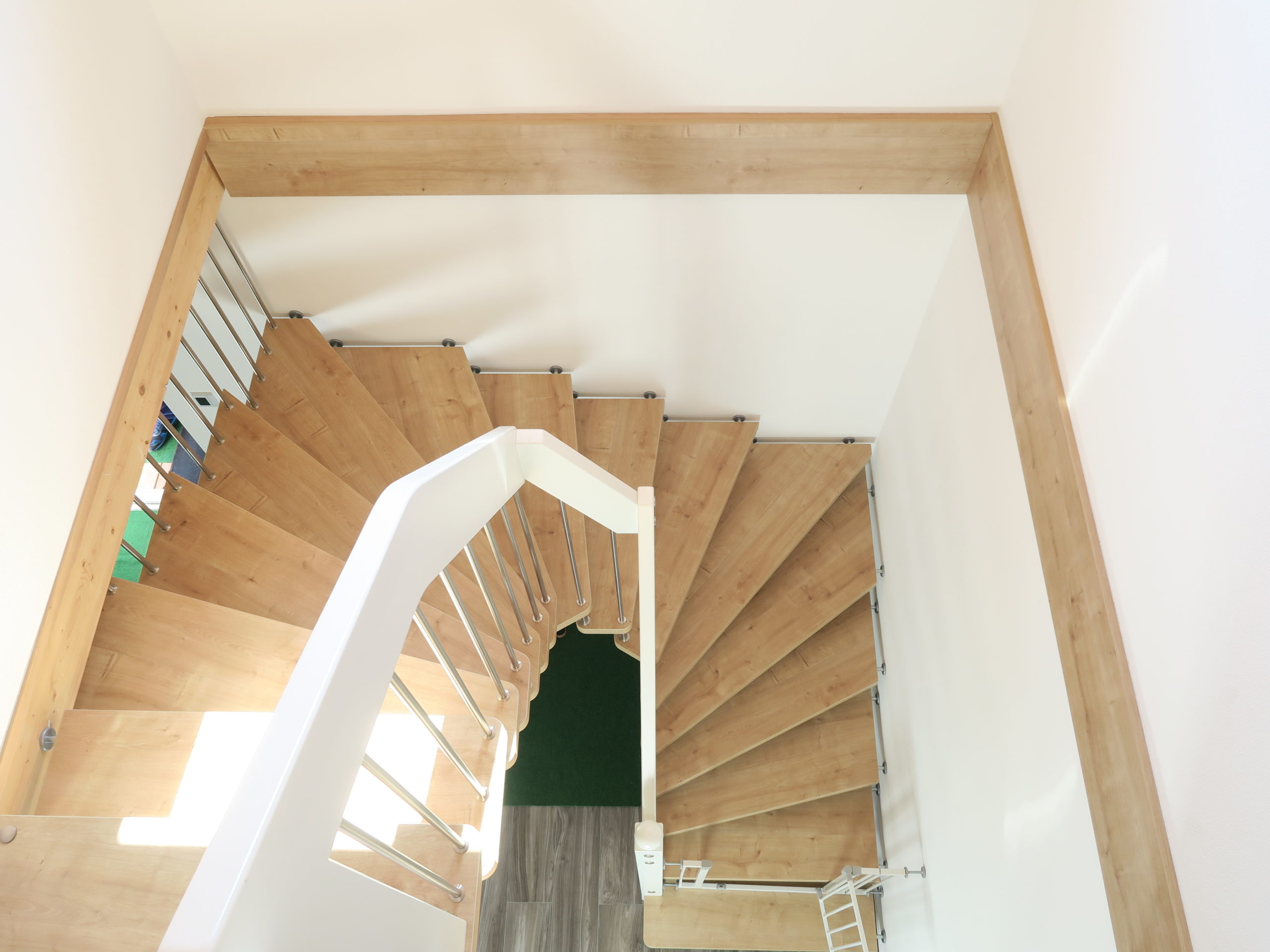 Aus Holzwerkstoff, gummigelagertes Tragbolzensystem und mit minimaler Stufenstärke 47 mm und 55 mm als WE1 und WF2 Treppensystem Grünewald mit Europ. Technischer Zulassung.